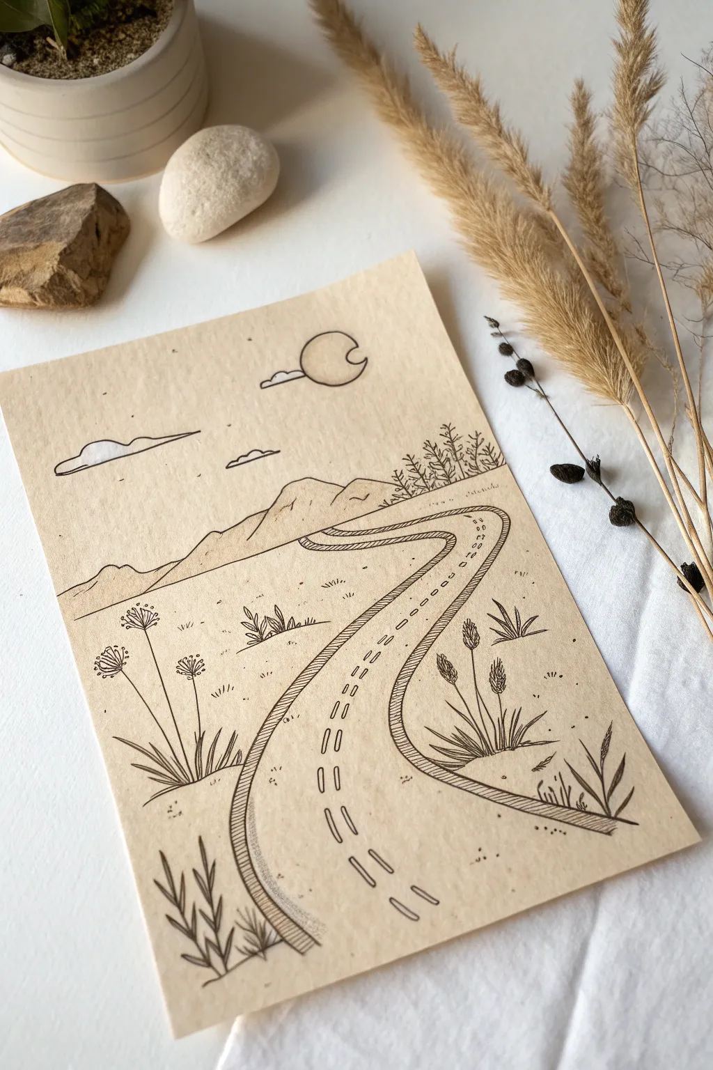 A drawing of a pathway winding into the horizon can symbolize life’s journey. I love how this simple concept can provoke deep reflection.
