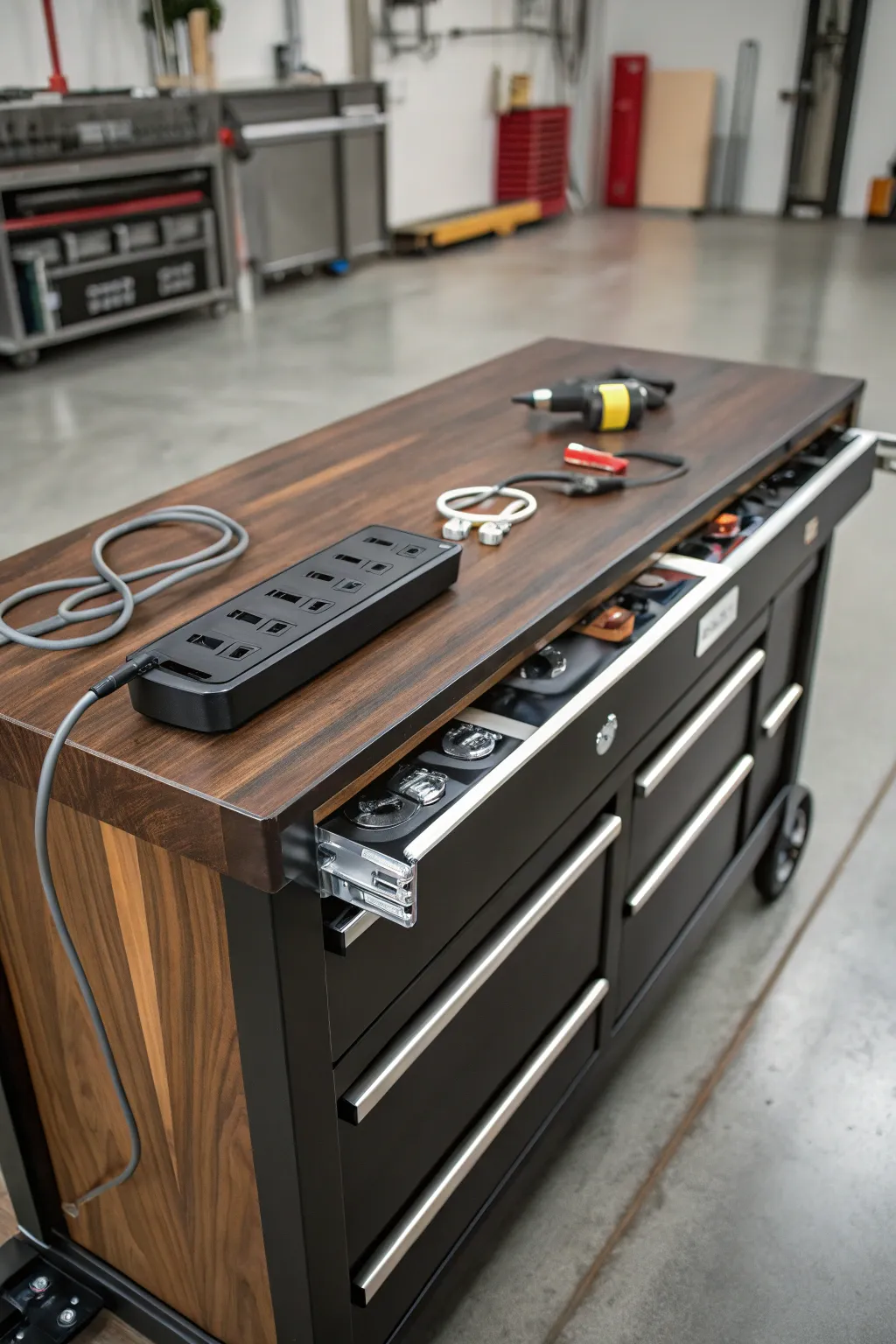 Streamline your workspace with a stylish rolling workbench and built-in power station for ultimate efficiency. #WorkshopGoals