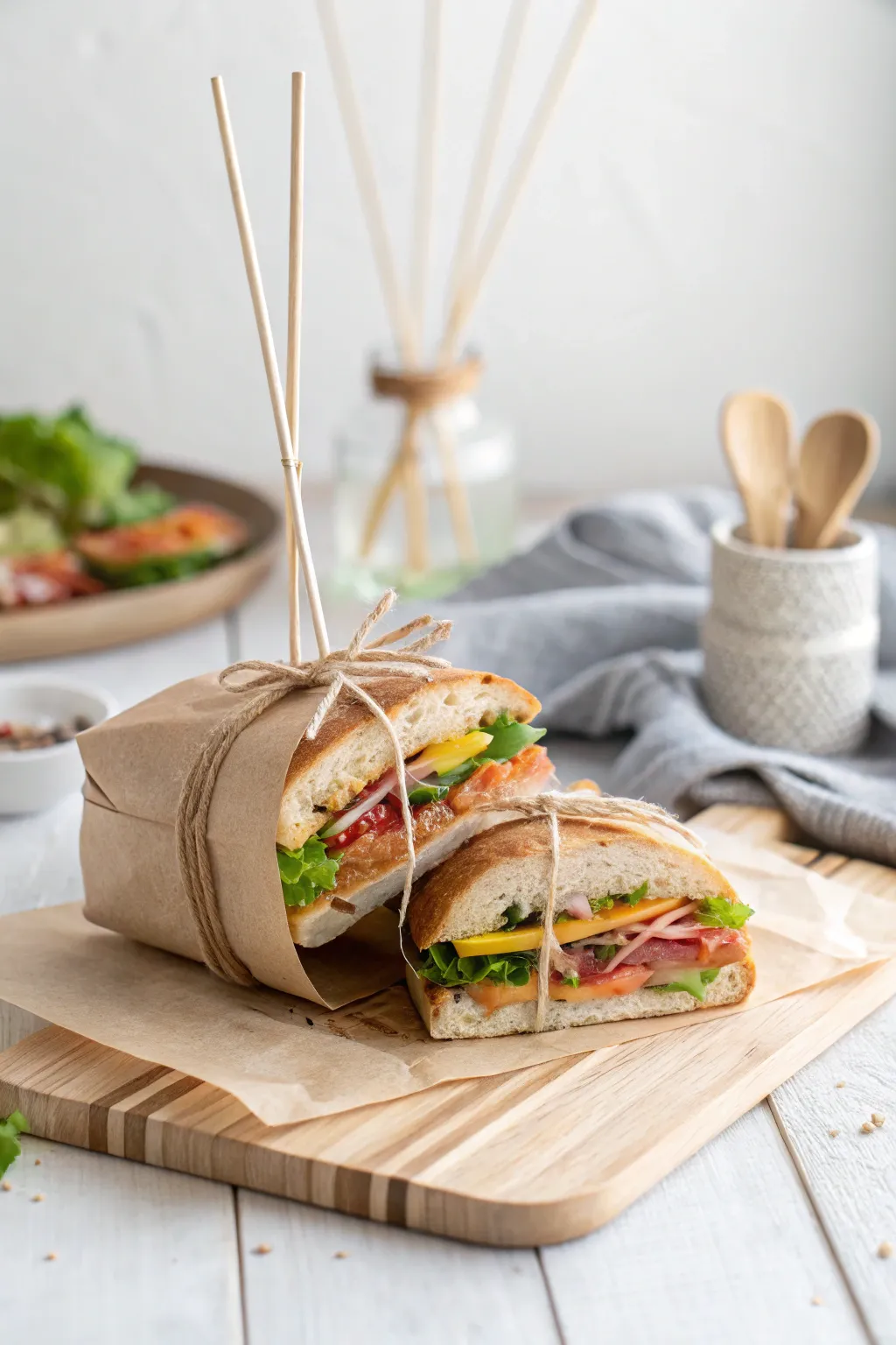 Adding bamboo skewers through a wrapped sandwich not only keeps it together but also adds a touch of elegance. I often use this for taller, layered sandwiches.