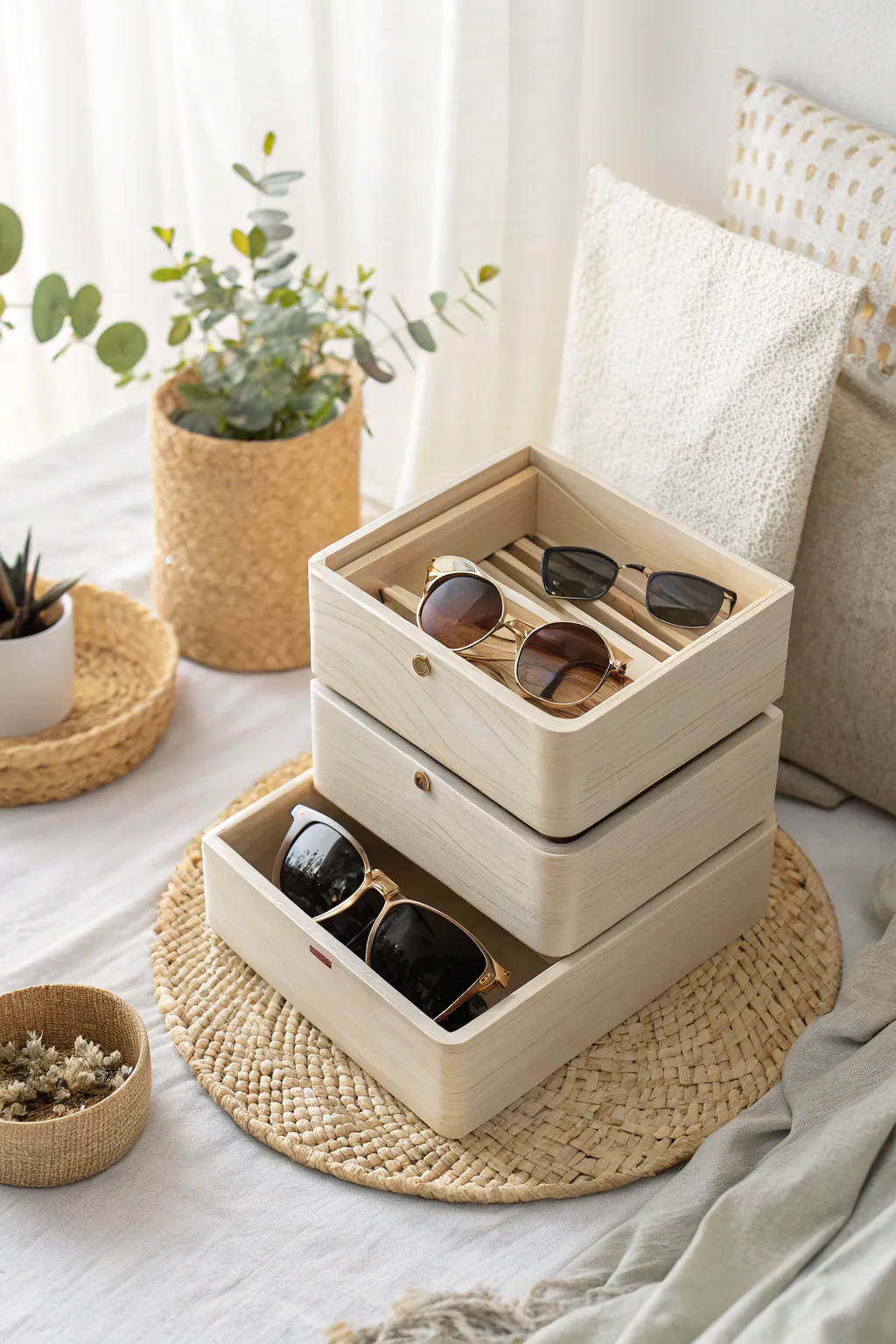 Use stackable storage boxes to keep your sunglasses safe and organized. These are great for protecting each pair while maximizing space.
