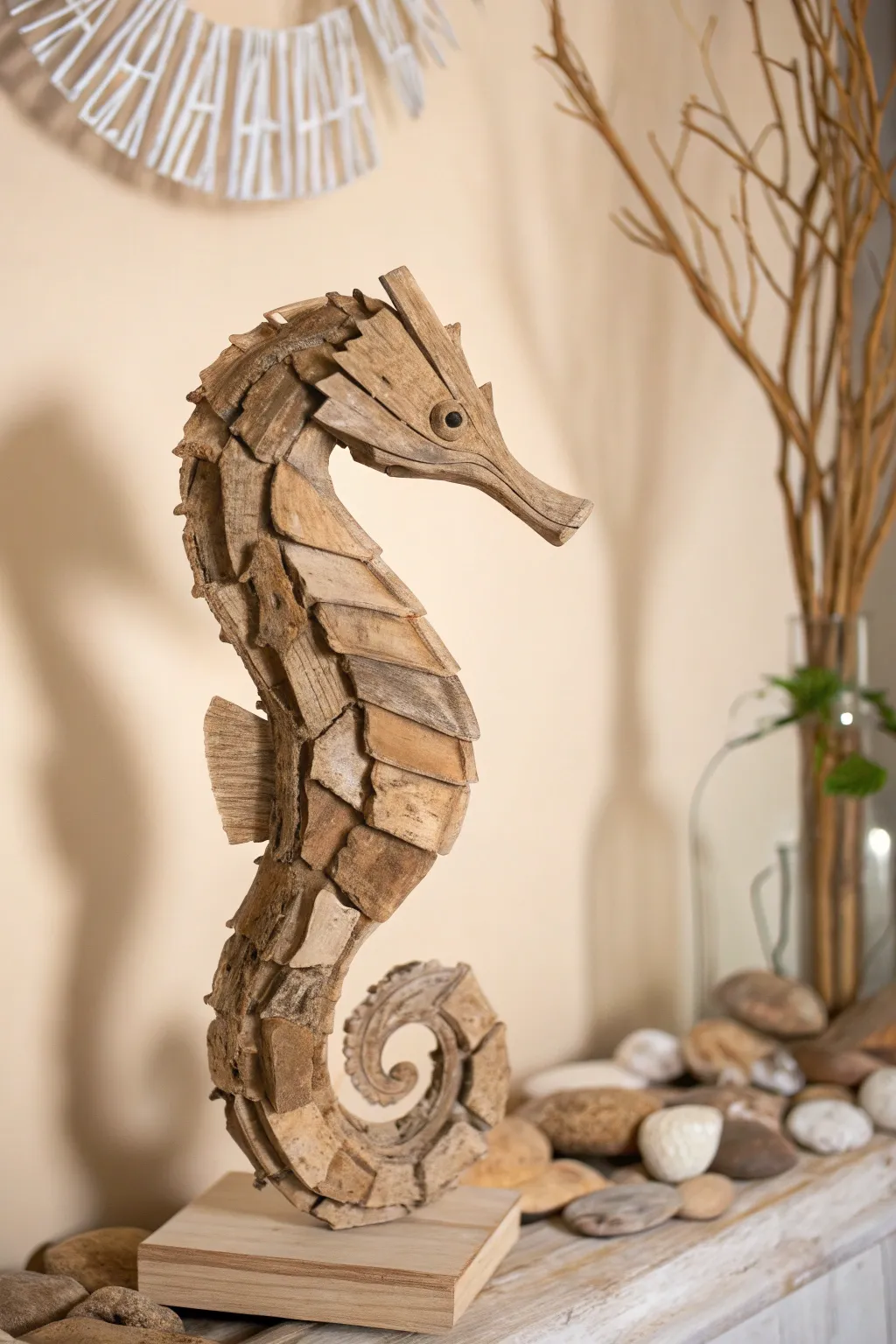 Craft a seahorse using driftwood or similar found materials for a coastal vibe. Mine hangs proudly in my bathroom, reminding me of beach days.