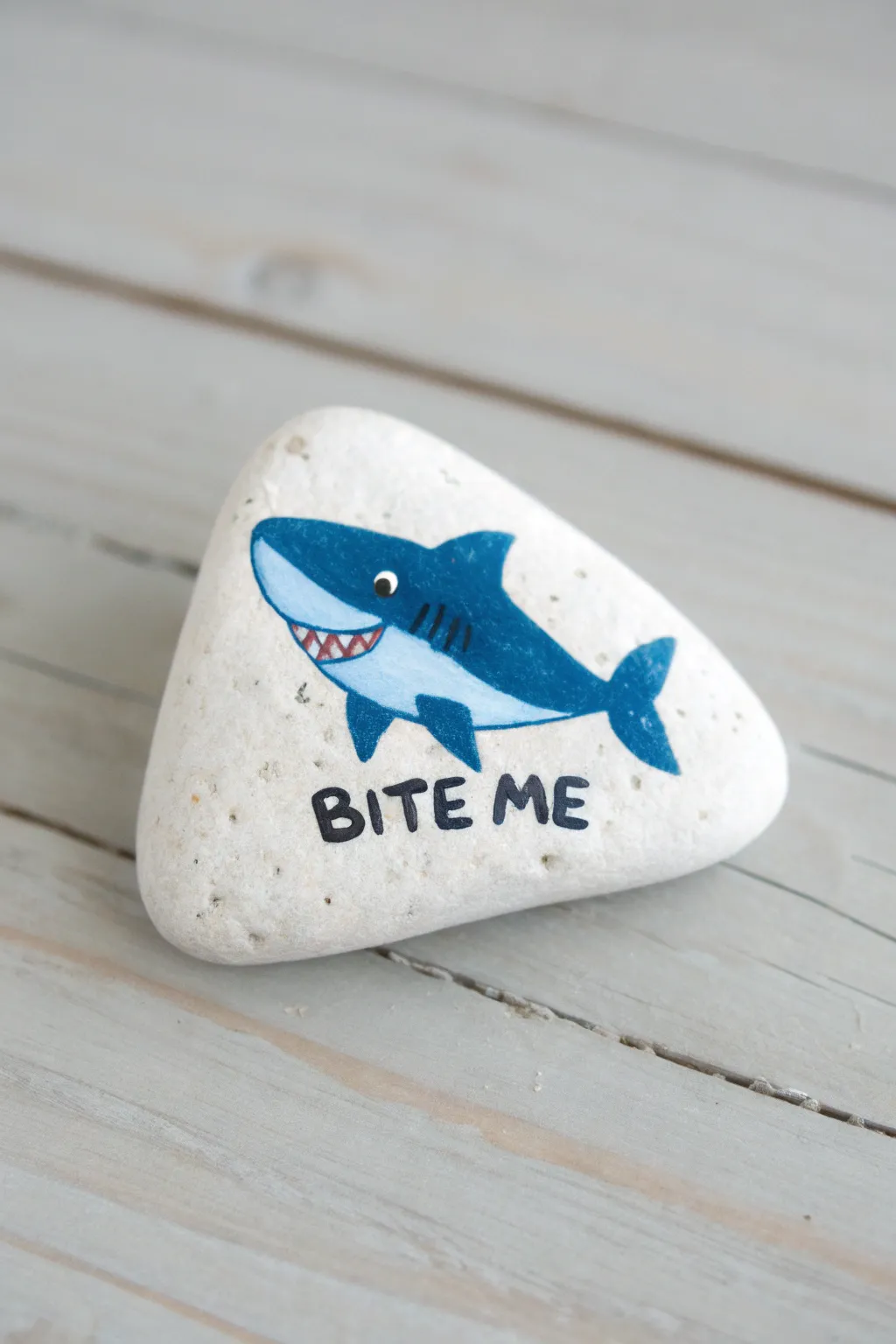 Paint a playful shark on your triangle rock, complete with cheeky text like ‘BITE ME’. These are a hit in my nephew’s room, adding a splash of humor and adventure.