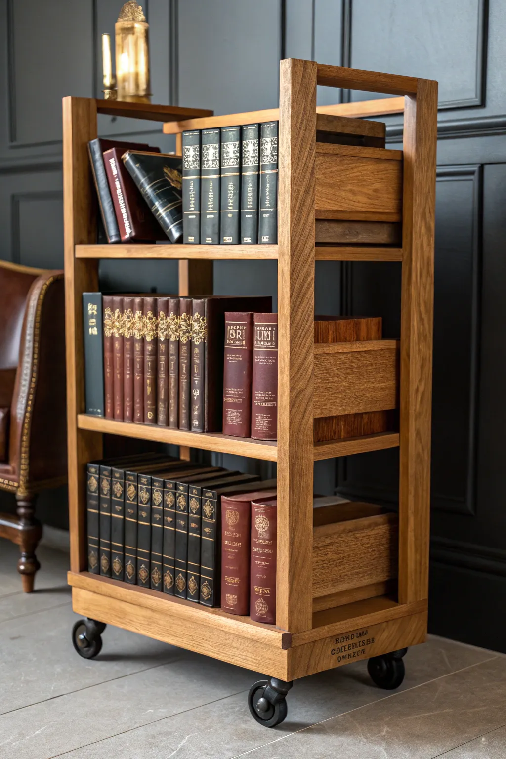 - Wooden Utility Cart: Make your mobile library stylish and practical with a durable wooden utility cart.