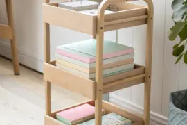 • Three-Tier Wooden Rolling Cart: Stay organized with a stylish wooden rolling cart, perfect for easy mobility and ample storage.