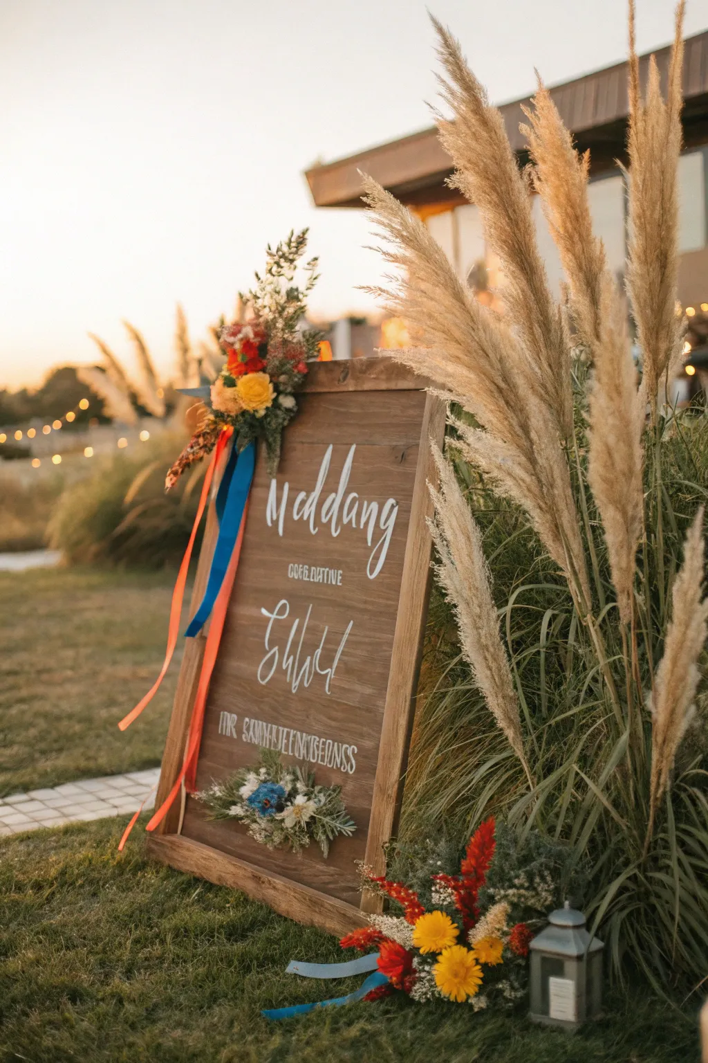 Frame your wedding sign with pampas grass for a bohemian feel. The texture and earthy tones create a laid-back yet stylish ambiance.