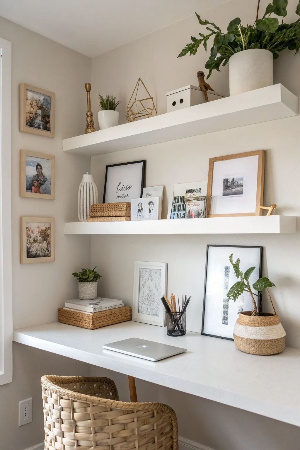 Use white shelves in your home office to display office supplies alongside personal decor. I like to mix in family photos and small artwork to keep my workspace inspiring.
