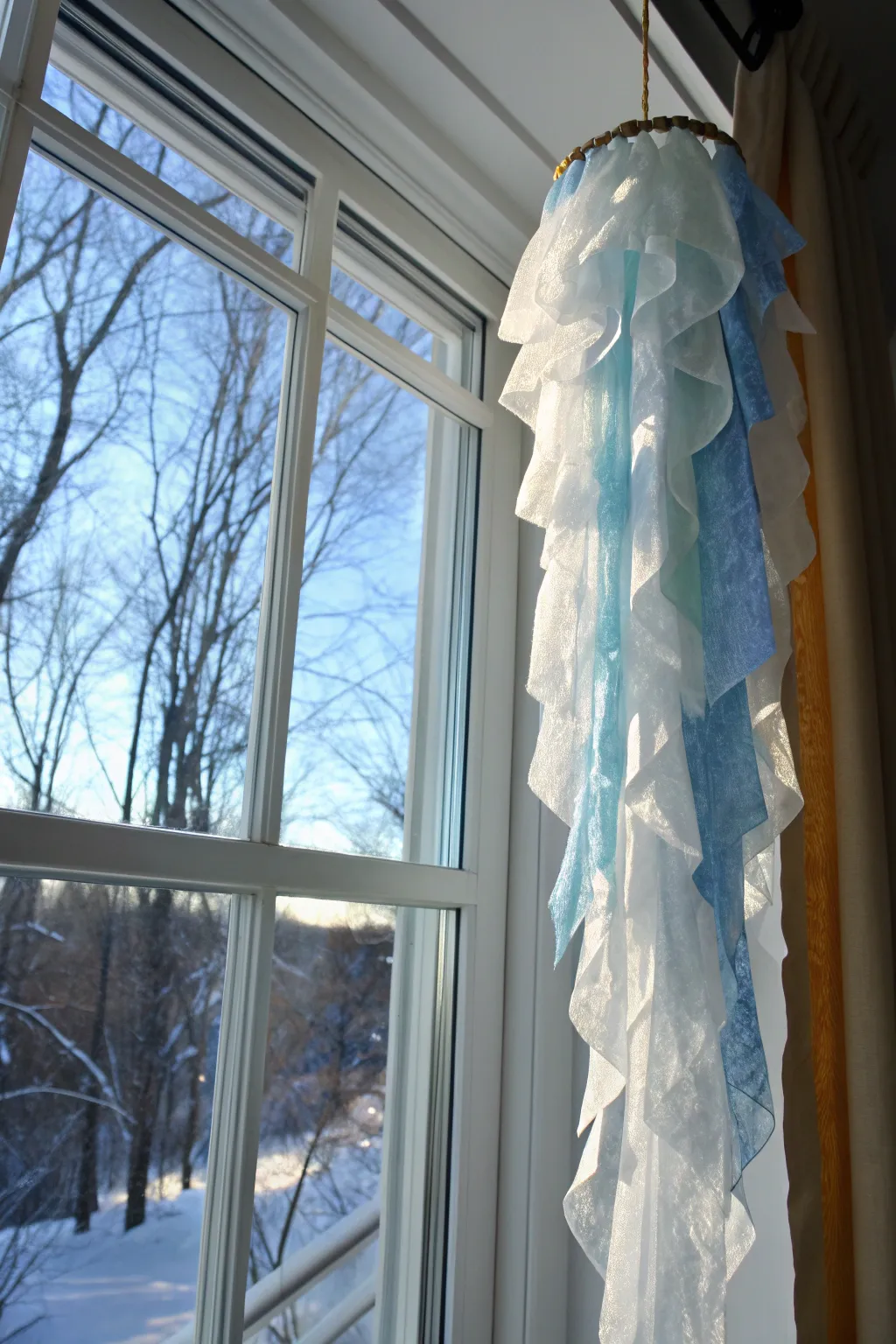 Drape icicles made from tissue paper and glue along your windows. The light shining through creates a magical winter wonderland effect indoors.