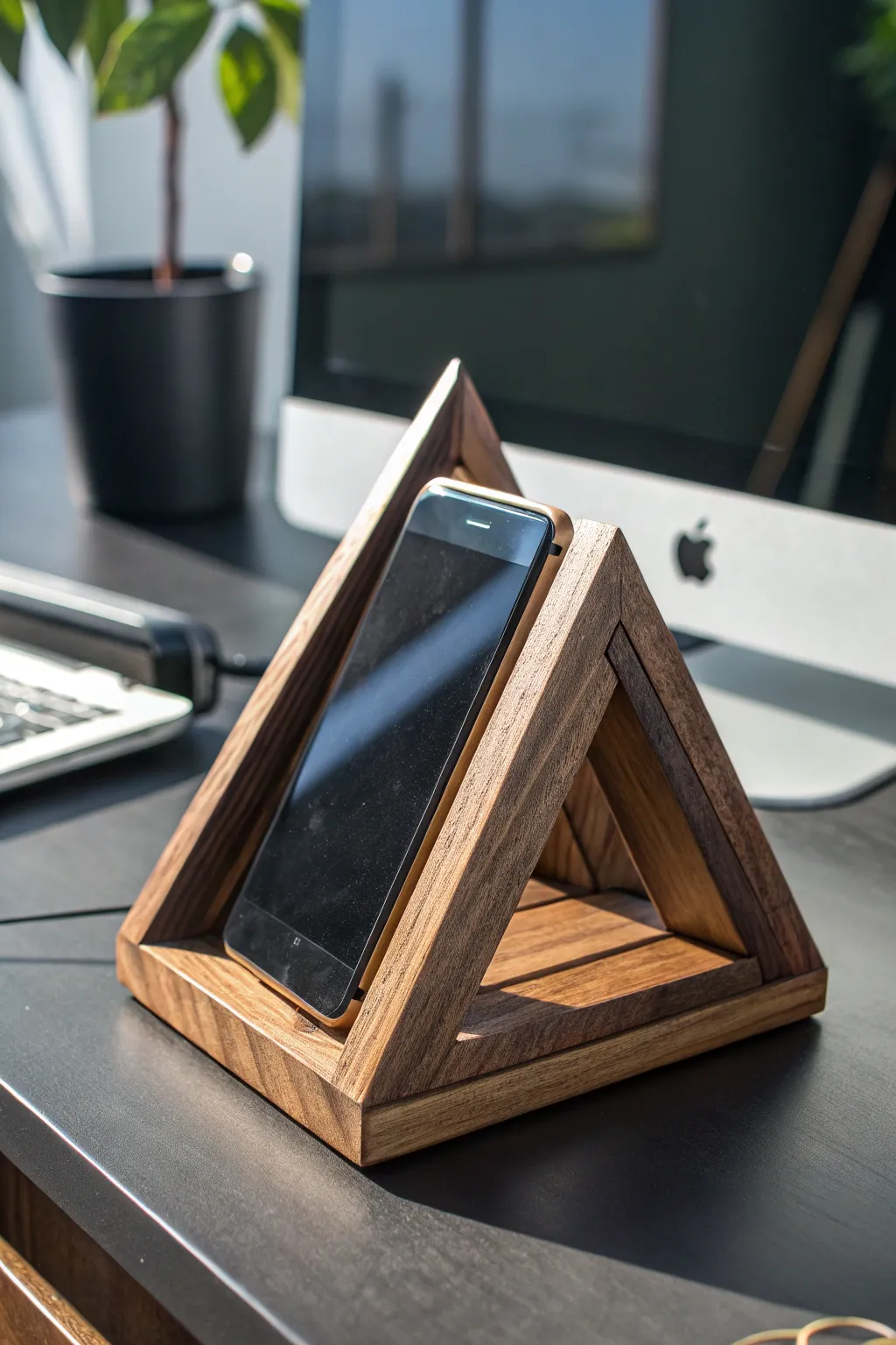 Triangles aren’t just for geometry class—they make for a stunning geometric phone holder! I crafted one using leftover wood, and it’s now the focal point of my workspace.