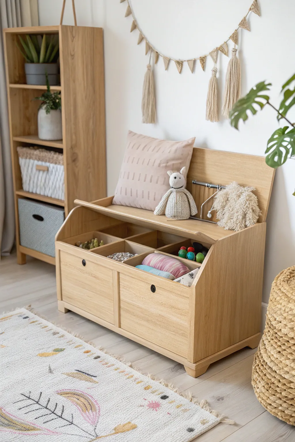 • Wooden Toy Box with Dividers: Upgrade storage with a wooden toy box featuring customizable dividers for easy organization.